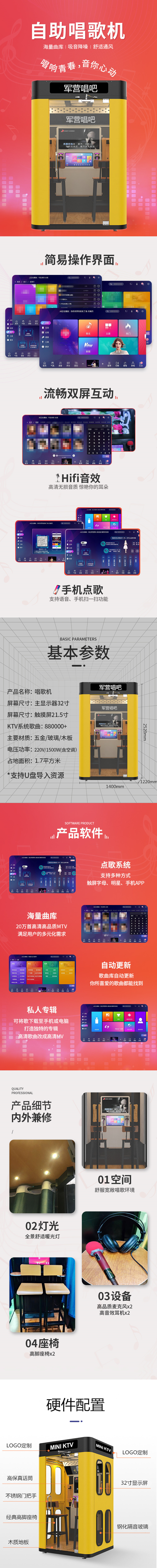 產品特點:軍營唱吧迷你版長寬高尺寸:1400mm*1220mm*2520mm,它的外觀設計非常有特色,顏色主打黃色,亮眼且時尚,兩側邊分別有4個橢圓形,橢圓形里面裝了隔音玻璃,內飾更是溫馨豪華,帶有通風系統和燈光系統,特加了空調系統,雙耳機,雙話筒,雙座椅,適用于:圖書館、黨建室、軍營、單位、企業公司等場所。