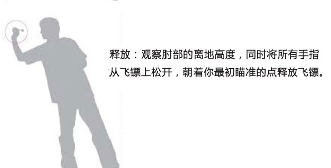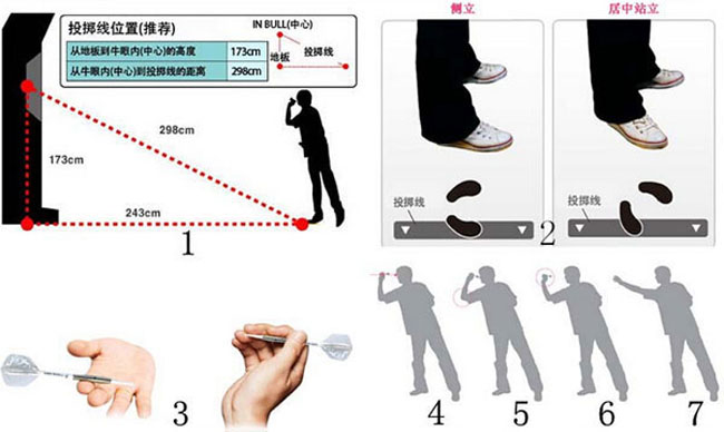 飛鏢分正手和反手,跟羽毛球握拍有些類似。正手法手臂在胸前,發鏢時候的視線和鏢靶的目標連成一線,以肘關節作為指點甩前臂把飛鏢發出。而反手法手臂放體測,發鏢發力位置放在大臂,大臂推動前臂,利用肘關節甩出飛鏢。因此,通過這兩種方法,可以清晰看出飛鏢的運行方式是不一樣的,正手飛鏢直線飛行,而反手鏢身是帶著旋轉飛行的。這兩種方法不論孰優孰劣,每個人的掌握度和情況都不一樣。看哪樣練的比較順手,都可以作為以后練飛鏢的參考標準。