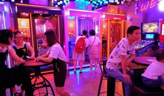全民K歌在杭州開了第四家店自助K歌店。它由7間迷你KTV房、休閑娛樂區(qū)和休息區(qū)組成,占地約500平方米。其中,休閑娛樂區(qū)設(shè)有彈珠機(jī)、自助販?zhǔn)蹤C(jī)、自助橙汁機(jī)等,頗為契合“自助”、“無人值守”的概念。看上去,這和傳統(tǒng)KTV、迷你KTV都不太一樣。