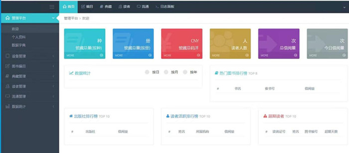 數據統計:支持顯示當日書刊借閱統計、當日圖書流通統計、熱門圖書排行統計、圖書分類數量統計、月借書量統計、圖書借閱趨勢統計、圖書分類數量統計、按月分類借閱偏好統計、圖書狀態統計等功能;