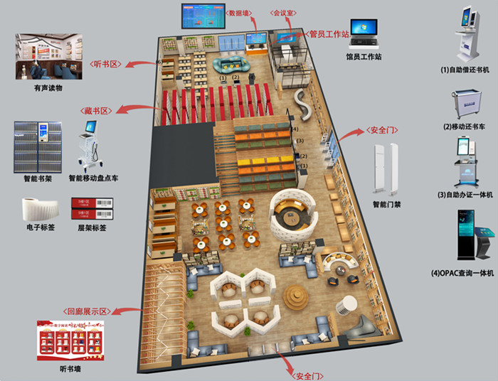 智能化圖書管理系統由:自助辦證機、自助借還機RFID安全門、自助殺菌機、館員工作站OPAC查詢系統智能盤點推車等,完全實現圖書館自助化管理。