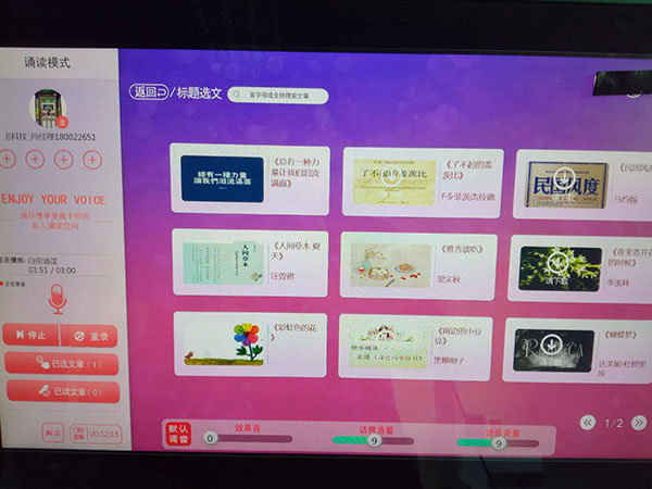 校園“朗讀亭”,以朗讀體驗方式為主,集朗讀練習、錄制、演講訓練、閱讀為一體,并可通過微信分享自己朗讀的內容。“朗讀亭”使用高強度全隔音鋼化玻璃,保證安全的同時阻隔95%的聲音,朗讀者關門后可靜享屬于自己的私密空間。朗讀亭專業定制的“朗讀亭”具有專業的錄音棚設備,頭戴式耳機和專業麥克風,可以滿足高保真音響、低噪音環境訴求,讓朗讀者在聽和朗讀的過程都輕松自然。而且,每個用戶用自己的微信賬號即可登陸,自動錄音和及時分享。